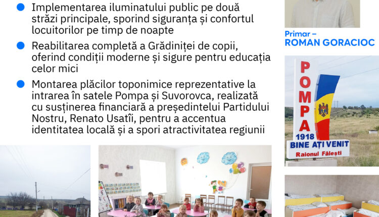 Roman Goracioc a fost ales de două ori primar al comunei Pompa, raionul Fălești, din partea Partidului Nostru. În primul mandat s-au reparat drumuri principale, s-a instalat iluminat stradal și s-a îmbunătățit infrastructura. Cu sprijinul locuitorilor și al liderului Partidului Nostru, Renato Usatîi, lucrările de dezvoltare și modernizare continuă.