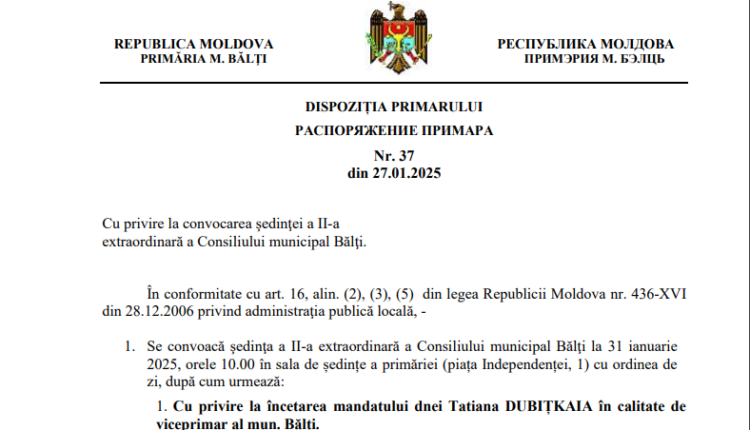 Primarul municipiului Bălți, Alexandr Petkov, a semnat dispoziția cu privire la convocarea ședinței extraordinare a Consiliului municipal în care urmează a fi examinată încetarea mandatului Tatianei Dubițcaia în calitate de viceprimar.