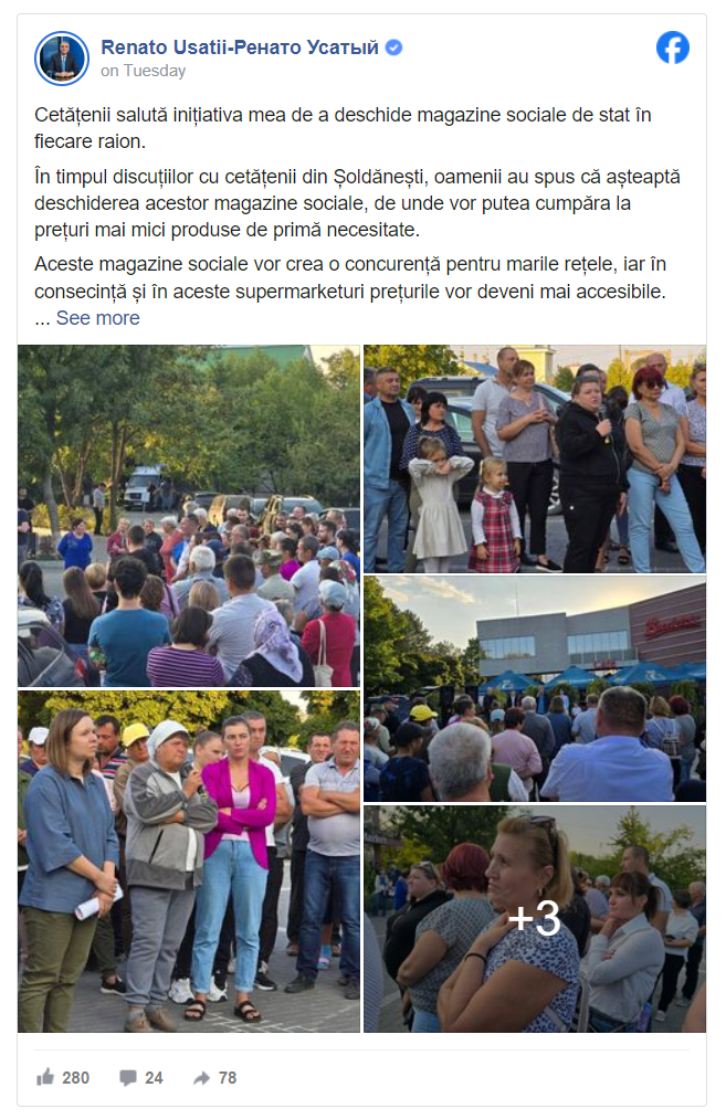 În timpul discuțiilor candidatului la funcția de președinte, Renato Usatîi, cu cetățenii din Șoldănești, oamenii au salutat inițiativa lui de a deschide magazine sociale de stat în fiecare raion. Potrivit lor, ei așteaptă deschiderea acestor magazine sociale, deoarece ar putea cumpăra la prețuri mai mici produse de primă necesitate.
