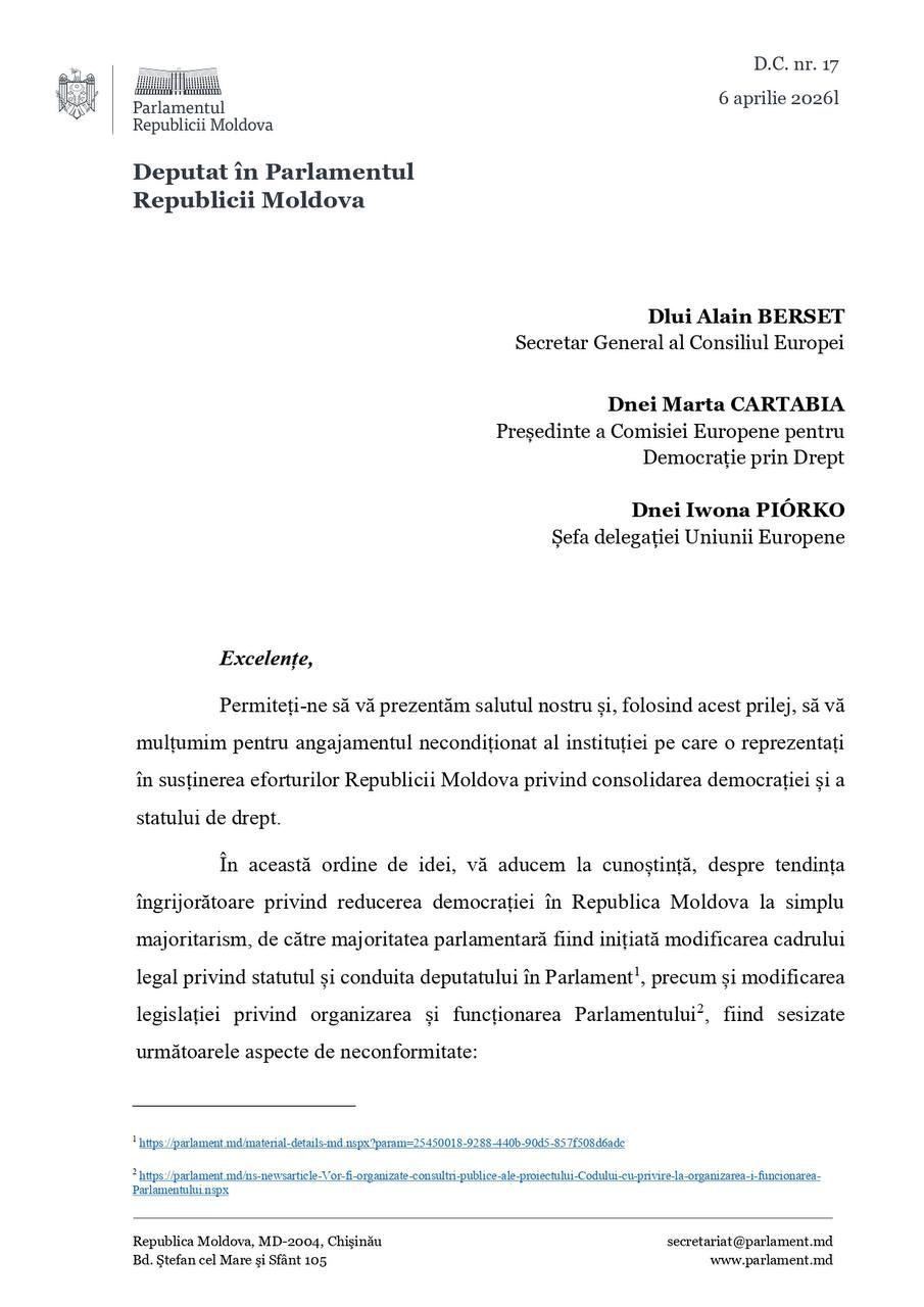 Prin aceste demersuri, opoziția parlamentară solicită atât conducerii Parlamentului, cât și instituțiilor europene, să intervină pentru a preveni un derapaj anti-democratic și pentru a asigura respectarea angajamentelor asumate de Republica Moldova.
