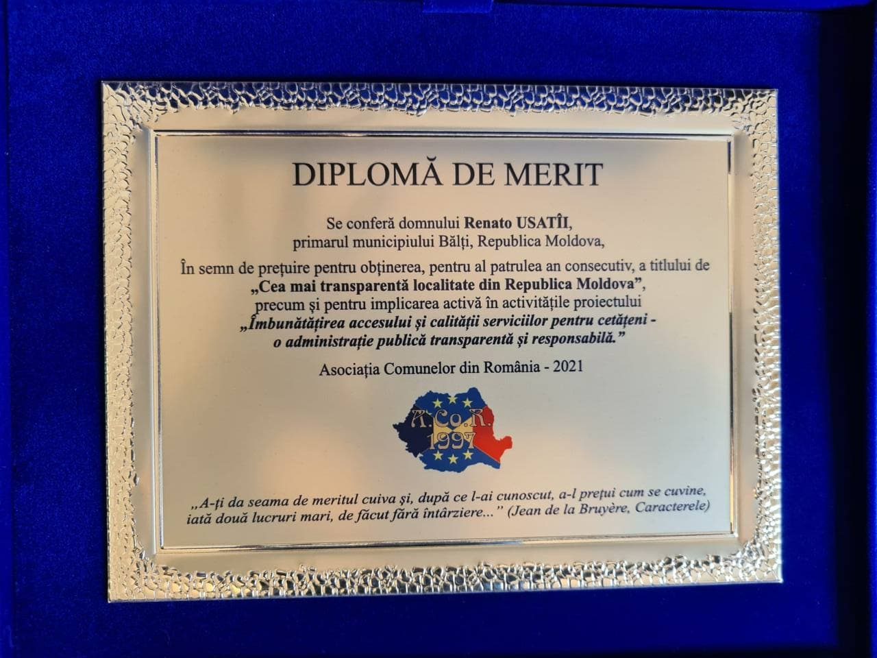 Renato Usatîi a primit o Diplomă de Merit din partea Asociației Comunelor din România. Certificatul i-a fost oferit ”În semn de prețuire pentru obținerea, pentru al patrulea an consecutiv, a titlului de ”Cea mai transparentă localitate din Republica Moldova”, precum și pentru implicare activă în activitățile proiectului ”Îmbunătățirea accesului și calității serviciilor pentru cetățeni – o administrație publică transparentă și responsabilă”.