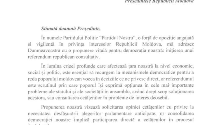 The Partidul Nostru (Our Party) addressed to the President and Parliament with a demand to initiate a consultative all-republican referendum on the issue of holding an early parliamentary election.
