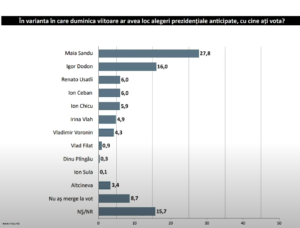 Conform datelor din sondaj, Maia Sandu, susținută de partidele de dreapta pro-europene, ar acumula 37 la sută din sufragii. Pentru fostul bașcan al Găgăuziei, Irina Vlah, susținută de partidele de stângă, ar vota 20 de procente de alegători.