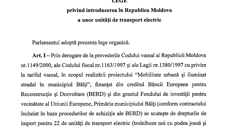 Troleibuzele cumpărate pentru locuitorii municipiului Bălți vor fi scutite de taxe vamale. Parlamentul a votat în a doua lectură un proiect de lege privind introducerea în Republica Moldova a unor unități de transport electric.