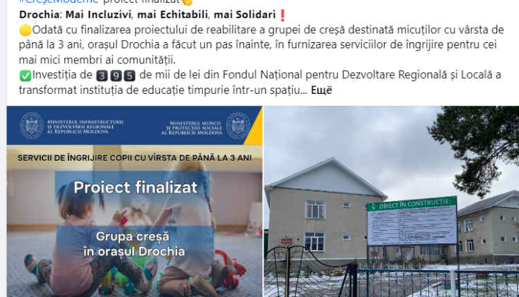 Partidul de guvernământ PAS își asumă laurii pentru un proiect realizat de primăria orașului Drochia. Recent, a fost dată în exploatare o grupă creșă din grădinița nr. 1, proiectul fiind parte a unui program mai amplu finanțat de Oficiul Național de Dezvoltare Regională și Locală și implementat de echipa primăriei. Anume primăria orașului Drochia a depus efort pentru a atrage fondurile necesare și a realiza lucrările de modernizare a instituției.