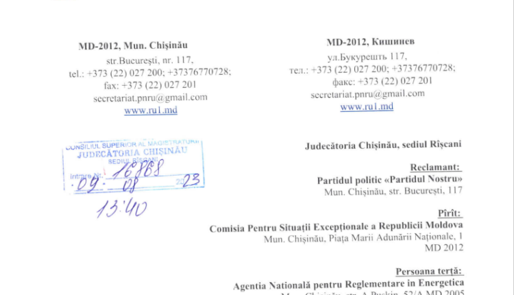 Partidul Nostru a acționat în judecată Comisia pentru Situații Excepționale (CSE) pentru a o obliga să dispună Agenției Naționale pentru Reglementare în Energetică (ANRE) aplicarea tarifelor micșorate la gazele naturale pentru consumatorii finali, aprobate la 7 iunie 2023, cu efectul retroactiv – începând cu 1 februarie 2023. Cererea de chemare în judecată a fost depusă de formațiunea politică miercuri, 9 august.