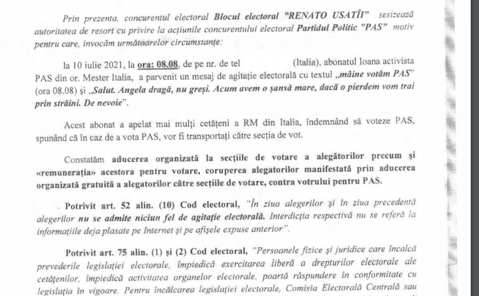 Следующая жалоба поступила в отношении партии «Действие и солидарность» (PAS). Представители блока Ренато Усатого заявляют, что активистка PAS в Италии обзвонила многих соотечественников, призывая идти на выборы и в случае голосования за PAS обещая организовать транспорт до избирательного участка.