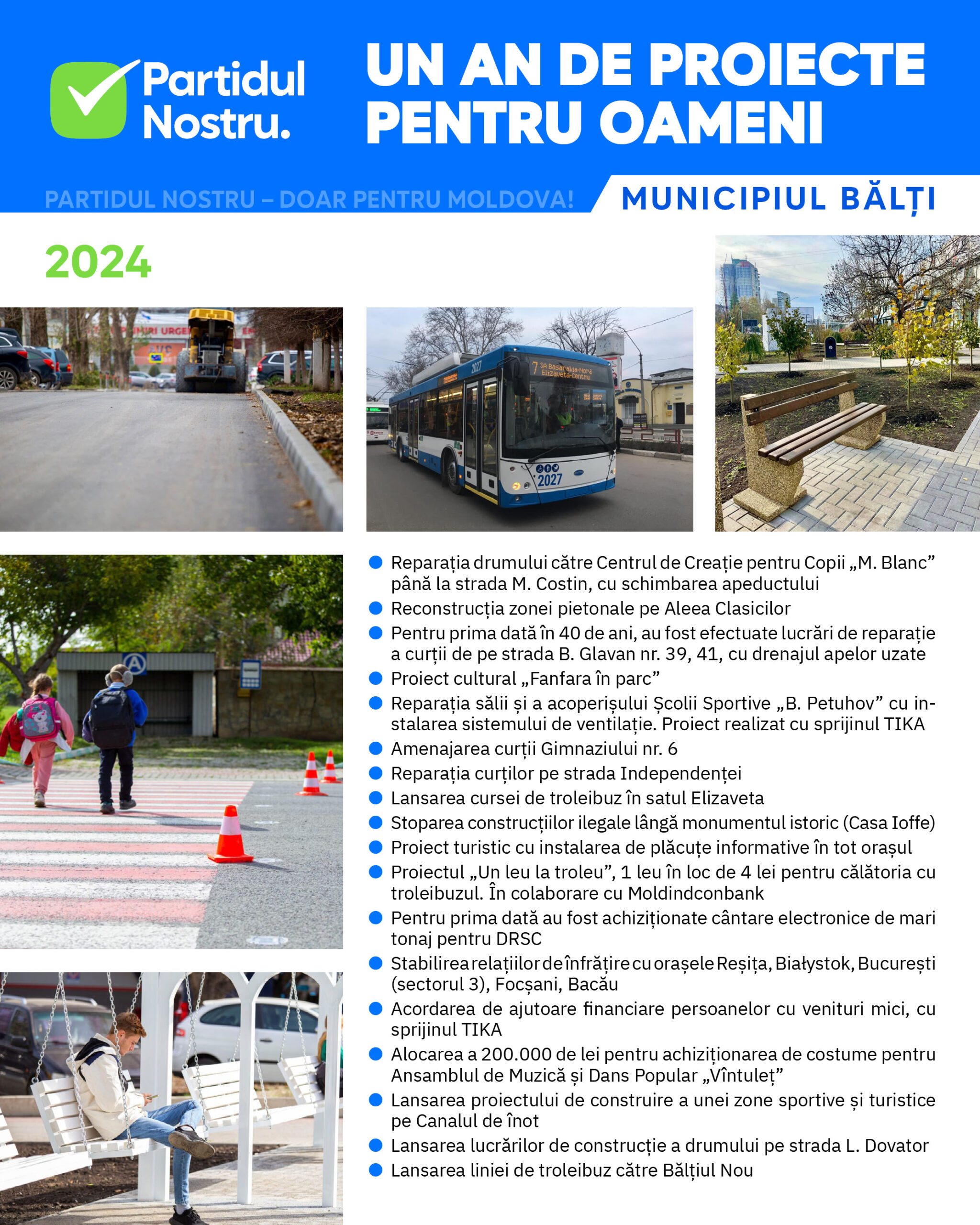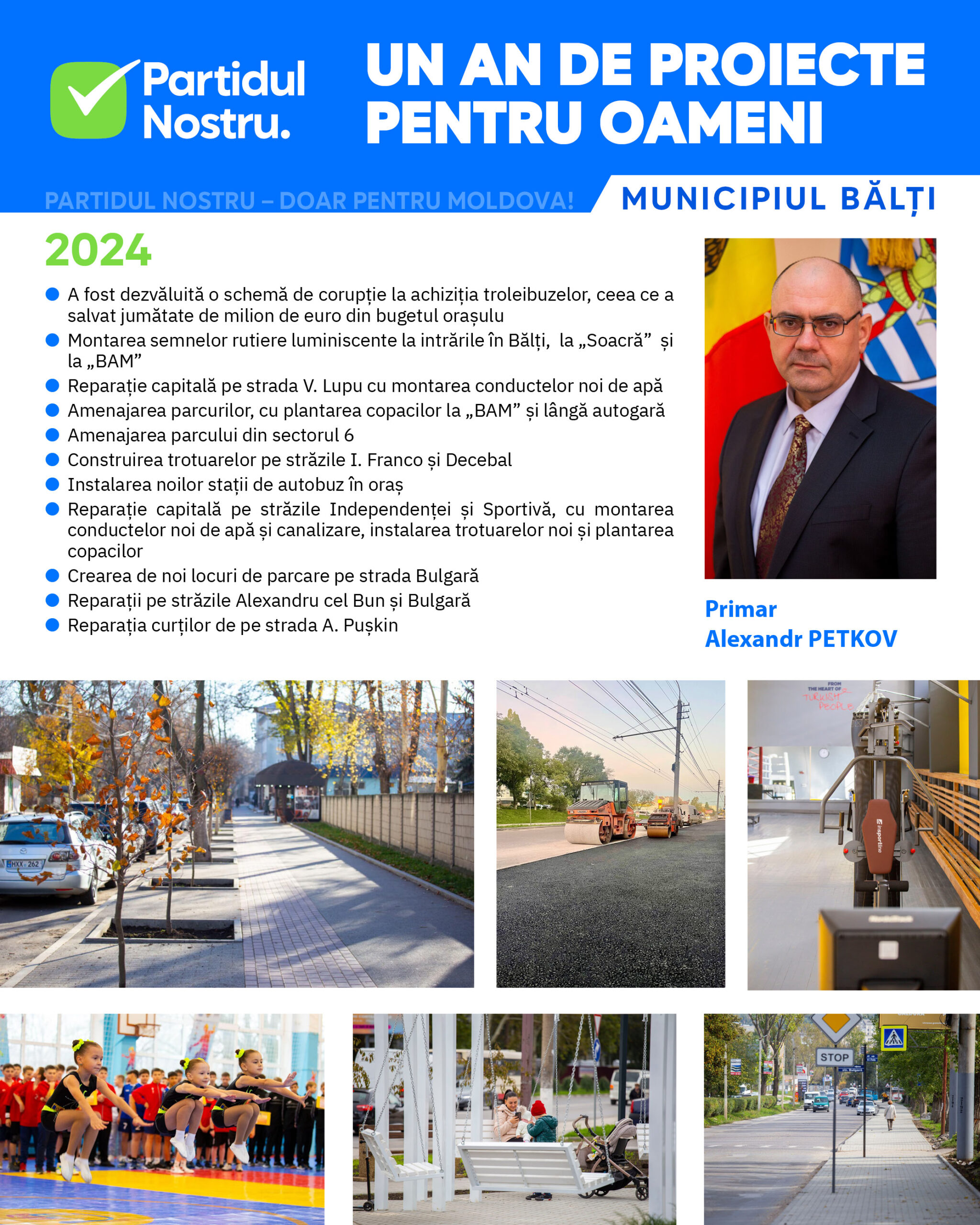 În anul 2024, în primul an de activitate al primarului Alexandr Petkov, la Bălți s-au obținut deja rezultate importante: au fost dezvăluite scheme de corupție care împiedicau dezvoltarea orașului; au fost reparate drumuri și curți; au fost lansate noi rute de troleibuz, iar spațiile publice au fost amenajate. Au fost implementate proiecte culturale și sportive importante, fiind consolidată și cooperarea internațională. În ciuda dificultăților și opunerii în cadrul Consiliului municipal, primarul a gestionat eficient sarcinile, beneficiind de sprijinul locuitorilor și al partenerilor. Desigur, mai sunt multe de rezolvat, iar drumul către renașterea completă a orașului nu va fi rapid. Cu toate acestea, pași importanți au fost deja făcuți, fiind puse bazele pentru dezvoltarea ulterioară.