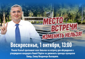 Președintele Partidului Nostru, Renato Usatîi, invită duminică toți bălțenii la o întâlnire pentru a discuta și aproba candidatul formațiunii politice la funcția de primar al municipiului Bălți. Locuitorii orașului vor putea, de asemenea, să își prezinte doleanțele concrete pentru echipa viitorului primar și a fracțiunii Partidului Nostru în Consiliul Municipal Bălți. Toți bălțenii sunt așteptați duminică, 1 octombrie, la ora 13:00, în Scuarul „Vladimir Vîsoțki” din Bălți.