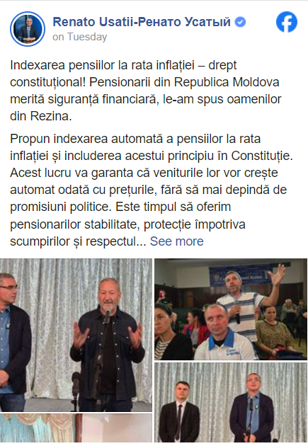 „Propun indexarea automată a pensiilor la rata inflației și includerea acestui principiu în Constituție. Acest lucru va garanta că veniturile lor vor crește automat odată cu prețurile, fără să mai depindă de promisiuni politice. Este timpul să oferim pensionarilor stabilitate, protecție împotriva scumpirilor și respectul pe care îl merită după o viață de muncă”, a delcarat Renato Usatîi.