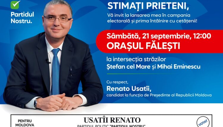 Renato Usatîi, candidat la funcția de președinte al Republicii Moldova din partea partidului Nostru, va da startul campaniei sale prezidențiale în orașul natal Fălești. Evenimentul va avea loc în centrul orașului, lângă Monumentul lui Mihai Eminescu, cu începere de la ora 12:00 și va continua cu o primă întâlnire electorală cu cetățenii.