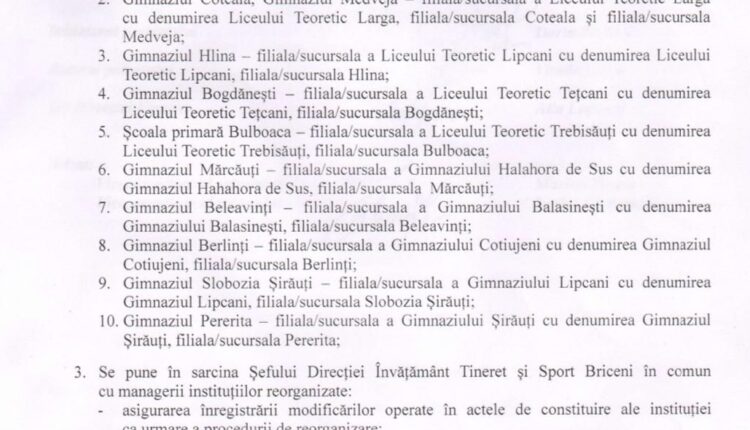Согласно решению, будут поглощены Гимназия-детский сад Крива, гимназии Котяла, Медвежа, Хлина, Богдэнешть, Мэркэуць, Белявинцы, Берлинцы, Слобозия Ширэуць, Перерыта, Булбоакская начальная школа. Администрации школ подлежат ликвидации. Будущее учительских составов неизвестно.