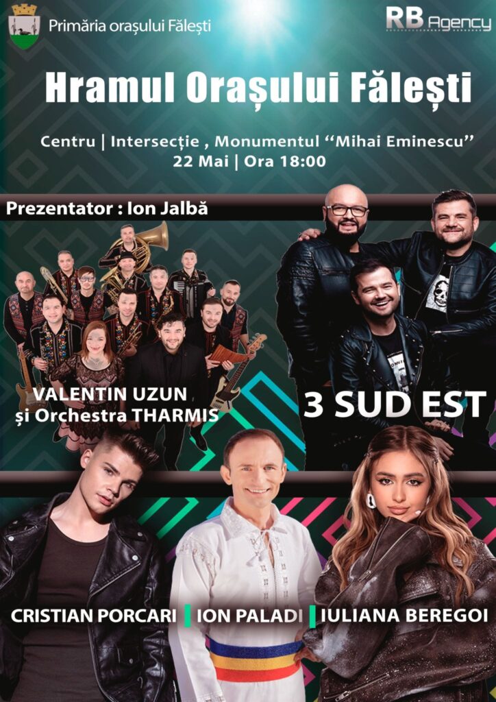 Хорошие новости по случаю праздника Фалешт только начинаются. Примэрия при поддержке друзей города подготовила множество других сюрпризов. Вечером 22 мая состоится большой концерт с участием группы 3rei Sud Est, исполнителей Юлианы Берегой, Валентина Узуна с оркестром Tharmis, Иона Палади, Кристиана Поркарь. Гостей ждут перед памятником Михаю Эминеску, начало в 18:00.