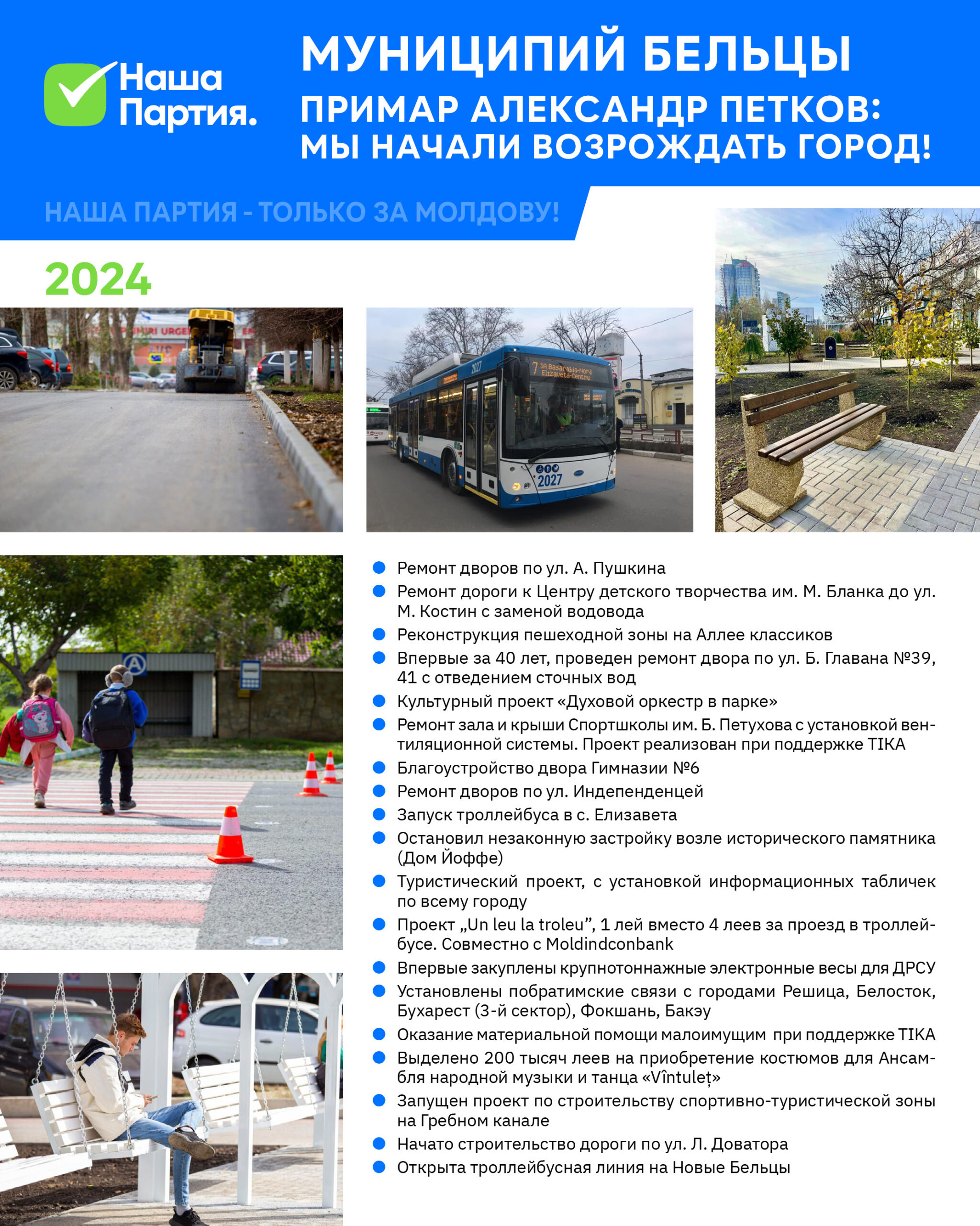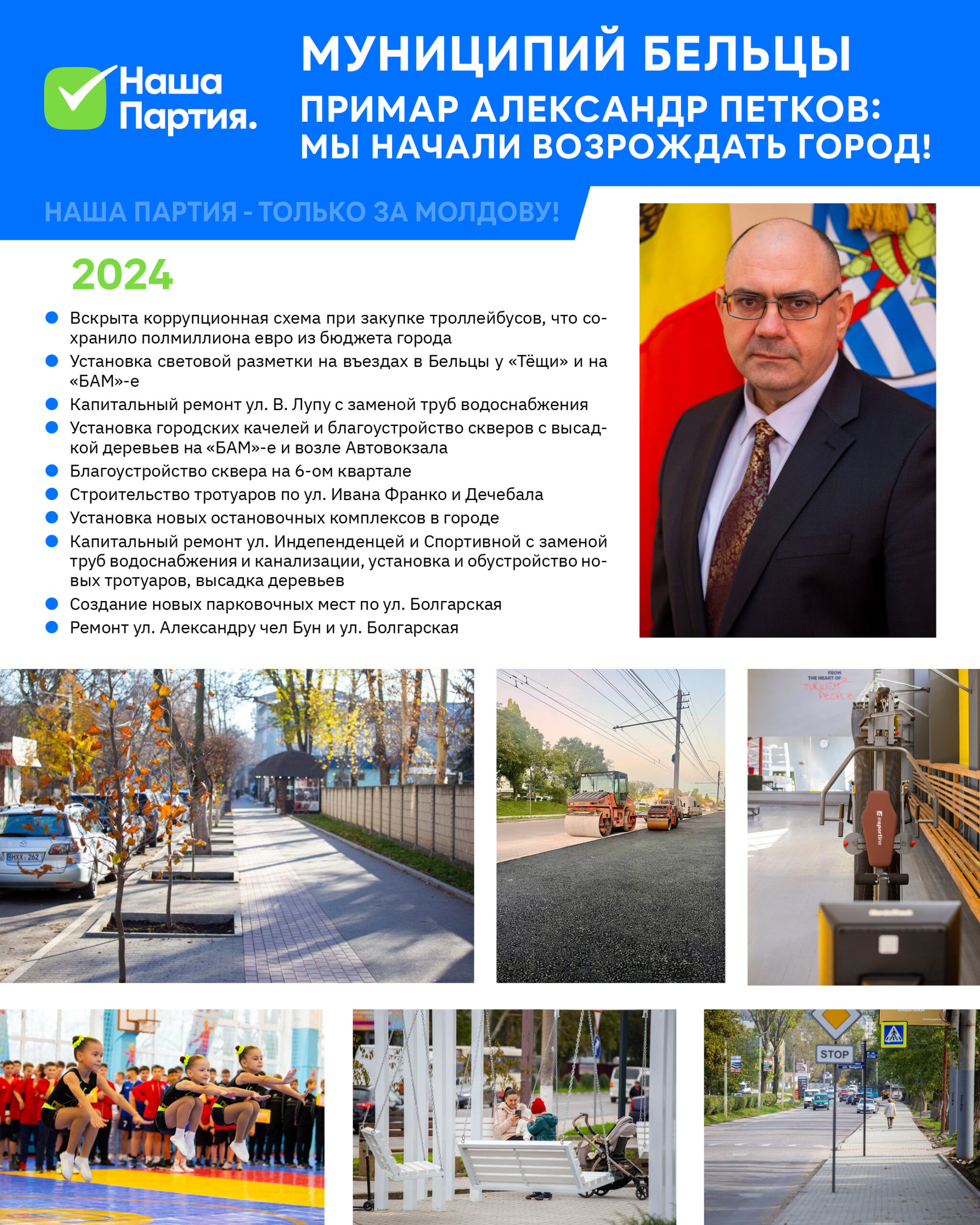 В 2024 году, в первый год работы примара Александра Петкова, в Бельцах уже удалось добиться значимых результатов: вскрыт ряд коррупционных схем, мешавших развитию города; отремонтированы дороги и дворы, запущены новые троллейбусные маршруты, обустроены новые общественные пространства. Были реализованы важные культурные и спортивные проекты, а также укреплено международное сотрудничество. Несмотря на сложности и сопротивление в муниципальном совете, примар эффективно справился с задачами, заручившись поддержкой горожан и партнеров. Да, ещё предстоит решить множество проблем, и путь к полному возрождению города не будет быстрым. Однако важные шаги уже сделаны и была заложена основа для дальнейшего развития.