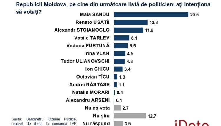Согласно опросу, в первом туре голосования Ренато Усатый наберет 13,3%, опередив на 1,7 процентных пункта кандидата от Партии социалистов Республики Молдова (ПСРМ) Александра Стояногло, который займет третье место. При этом 12,7% респондентов пока не определились, за кого будут голосовать, 3,5% отказались ответить, а 2,7% ответили, что не пойдут на выборы.