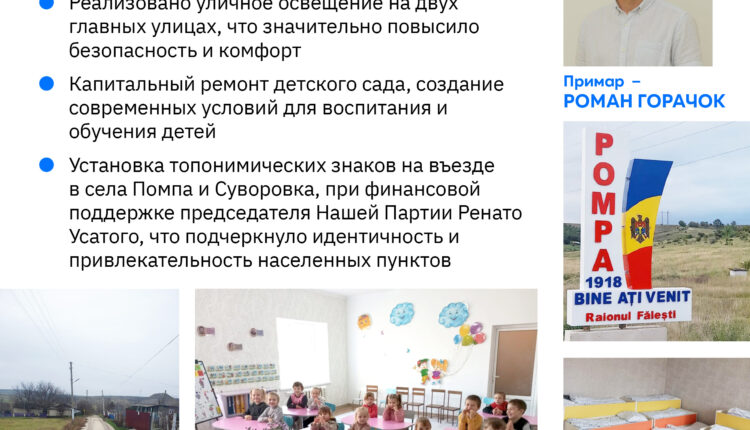 Роман Горачок дважды избирался примаром коммуны Помпа Фэлештского района. Оба раза — от Нашей Партии. В первый мандат были проведены ремонт значительной части основных дорог, освещение улиц, развитие инфраструктуры. И в этом году, с помощью жителей коммуны и при поддержке председателя Нашей Партии Ренато Усатого, развитие и благоустройство продолжилось.